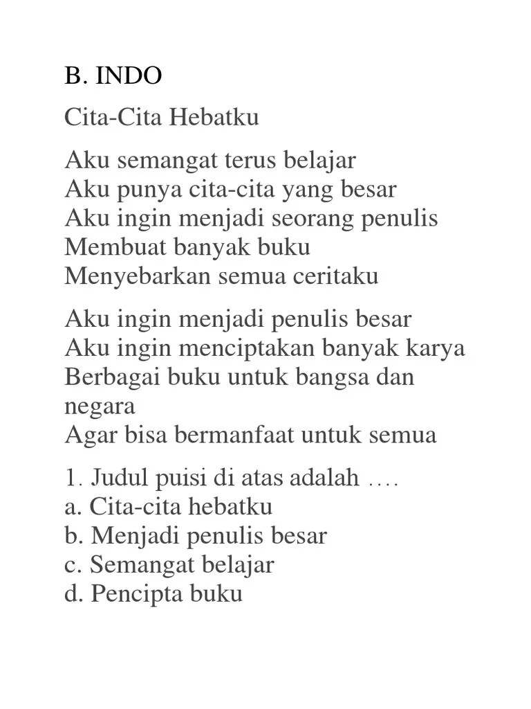 Kumpulan contoh puisi tentang cita cita menjadi dokter, guru, polisi, tentara, pramugari, pengusaha, pilot, koki, arsitek, desainer, hingga presiden.